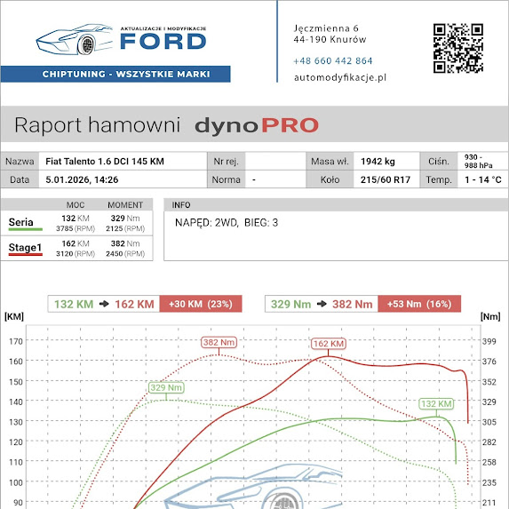 INFORMACJE USŁUGA: Zwiększenie mocy i momentu obrotowego (Ecotuning) - obniżenie zużycia paliwa. OCENA: Fiat Talento 2018 1.6 DCI 145 KM > zwiększenie mocy i momentu obrotowego (Ecotuning ) – obniżenie zużycia paliwa.Przyrost 30 KM , 53 Nm,Pomiary :Seria 132 KM, 329 Nm,Stage1 162 KM, 382 Nm. POPRZEDNI NASTĘPNY